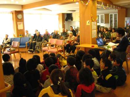 昔話の語り口調でしっかりと発表できました。ハートフルのお年寄りの方々も にこやかに子どもたちの発表に聞き入ってくださいました。