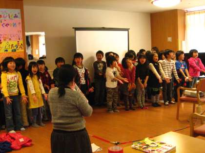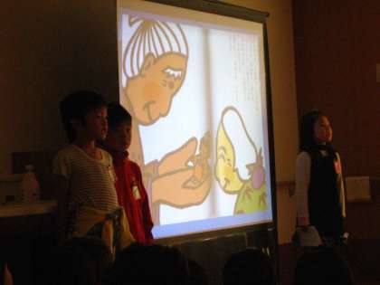 きょうは,1年1組の発表会。みんな,民話をしっかり覚え,