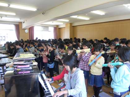 日頃は各クラスで練習をしていますが,155人全員で音を合わせるとなると,大変です。