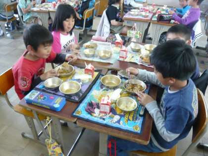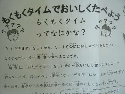 給食の時間,はじめの10分間はしっかり食べることに集中できるように,お話をしないで,もくもくタイムをしています。