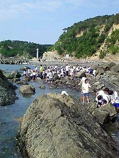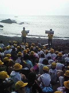 宮崎浜で志摩マリンランドの職員さんのお話を聞いているところです。