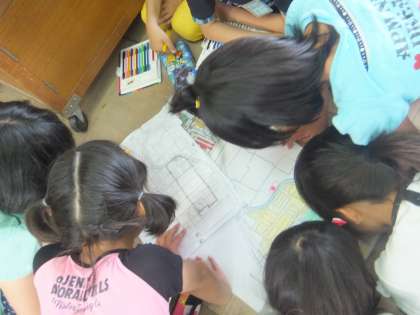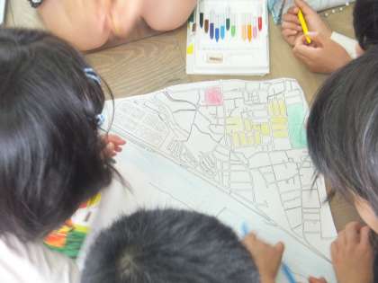 1回目の校区探検をし,わかっているところを大きな校区地図に表しました。