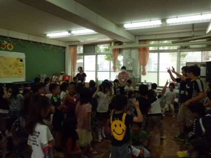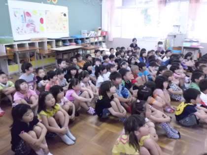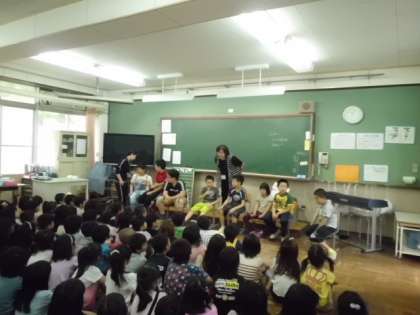 この日は、1年、1組、4組、5組のみんなが、ひまわり学級の子どもたちと交流しました。歌を歌ったりゲームをしたりしているうちに、友達になりました。これからもいっしょにたくさんの活動がしたいと言っていた1年生でした。