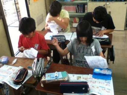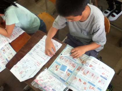 家庭科では,針と糸を使って玉止め,玉結び,なみぬい,本返しぬいなどの学習をしています。
