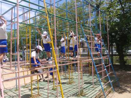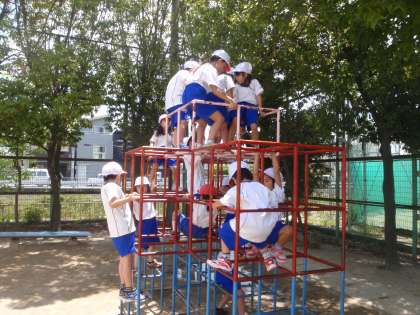 体育の時間に総合遊具やジャングルジムにのぼりました。1年生は、上がることのできる高さに制限を設けていますので、一番高いところに上がることはできませんが、体育の時間に安全に気をつけながら楽しみました。