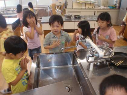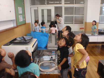学校探検で訪れた家庭科室は大きなキッチンでした。工夫された調理台や大きな道具に興味が向いていました。ミシンや指導机の様子を映す天井の鏡にも興味を示していました。