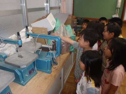 1年生にとって図工室は初めて目にするものばかりでした。電動糸のこやスチロールカッター、エッチングプレス機など、質問がたくさんありました。不思議な部屋に見えたようです。