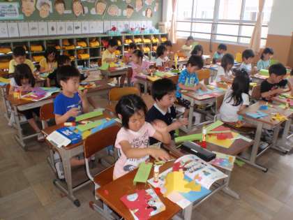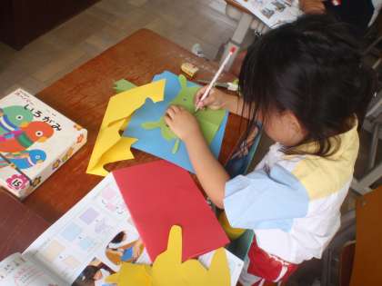 図画工作の学習で、「おって、たてて、ゆめのまち」をしました。色画用紙を切り、折ることで立て、夢の町を作ります。動物や乗り物、建物が次々とできてきました。どんな夢の町ができるか楽しみです。