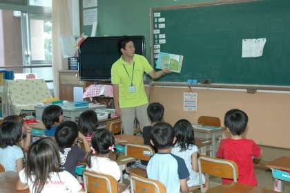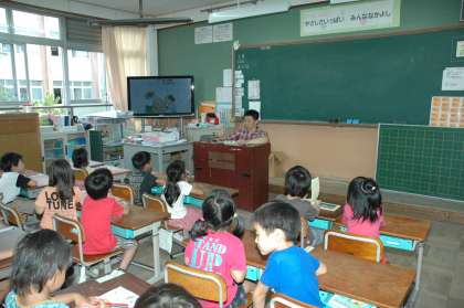 あじさい読書週間の4日目は、5年生の先生方に、1年生の教室で読み聞かせをしていただきました。大きな絵本を見ながら進められる話や、大型テレビの画面を見ながら進められる話など、子どもたちは目を輝かせて聞いていました。