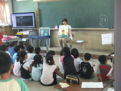 あじさい読書週間では毎日いろいろな学年の先生が昼のステップタイムに本の読み聞かせをしに来てくれます。