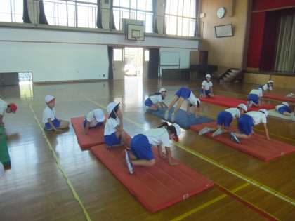 準備運動で気をつけるポイント,マットの準備の仕方や補助運動の仕方などを学習しました。