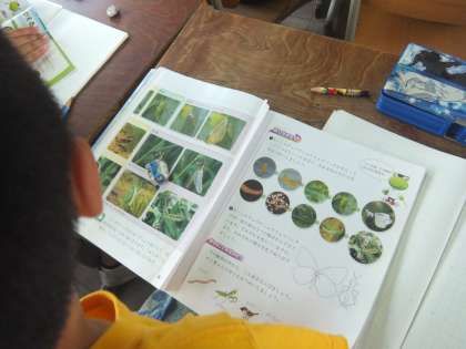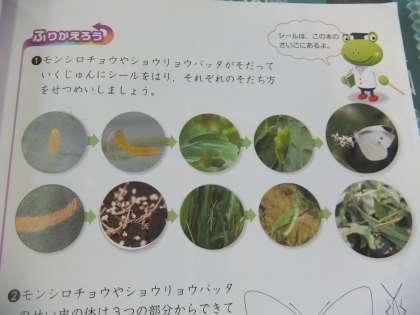 教科書の後ろのページにある写真シールを使って,昆虫の育ち方を順を追って確かめました。