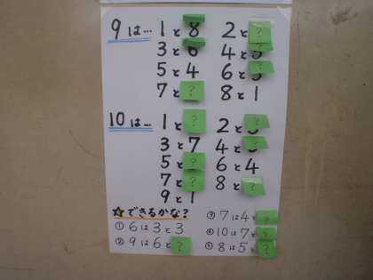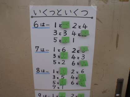 算数で、「たし算」の学習が始まりました。たし算の学習の基礎となるのが、前単元の「いくつといくつ」の学習です。今でも休み時間になると、掲示物を使って復習しています。