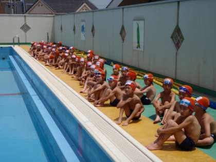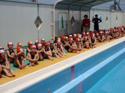 朝は曇っていましたが、予定通りプール学習をしました。天候は急速に回復し、陽射しが痛いぐらいのプール学習日和になりました。初めてプールを目の前にして「大きい」という声が上がっていました。しばらくは低水位で水慣れをします。
