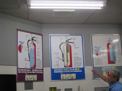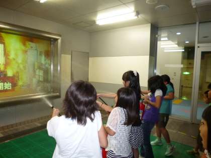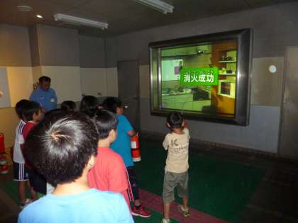 消火訓練室では,消火器の仕組みや使い方を学習した後,実際に映像を使った火災現場を消火体験する活動をしました。