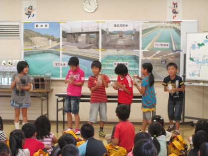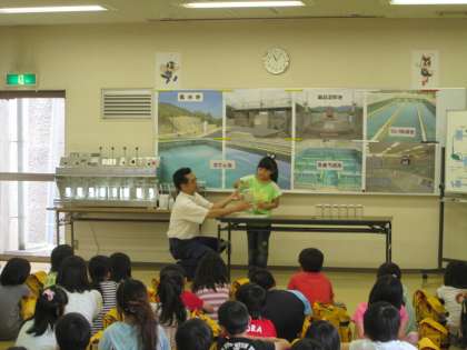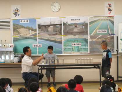 浄水場見学のまとめとして,浄水場の機械と同じ役割をする道具を使って,実際に水をきれいにする体験をしました。