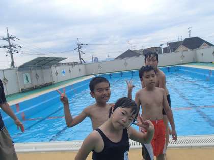 呉竹総合支援学校のお友達といっしょに、プールで交流しました。広いプールで、たくさん活動した後の写真です。ポーズがきまってるでしょ!!