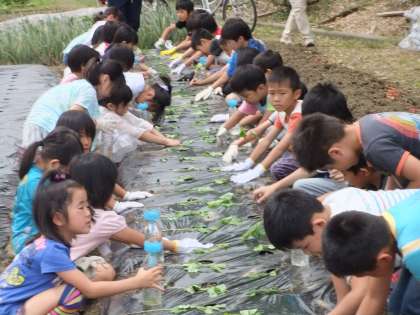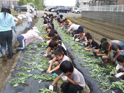 学校の畑に枝豆とサツマイモの苗を植えました。