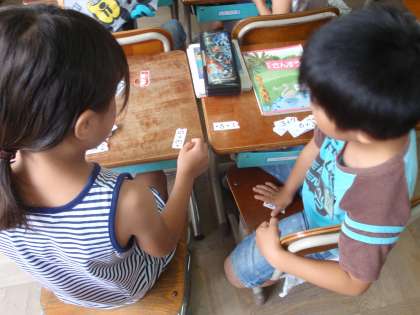 たし算のまとめで、計算カードを使ってゲームをしました。二人組で対戦します。お互い1枚ずつ同時に、たし算式の書いたカードを出し、答の大きさを比べます。自分の出したカードが勝ったか負けたかを素早く計算して答えます。計算の速さを養いながら楽しい学習でした。