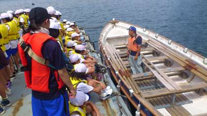 カッター訓練にチャレンジします。説明をしっかり聞いて、みんなで海に漕ぎ出します。
