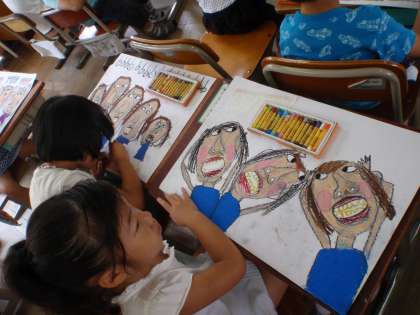 プールに入る前にシャワーを浴びます。キャーキャー言いながら水をかぶる、その時の様子を絵にしています。ビックリしたり、喜んだりしながら、騒いでいる様子がわかるように描いています。来週の参観日には、それぞれの教室で掲示します。楽しみにしていてください。