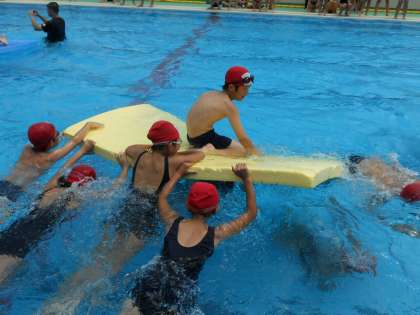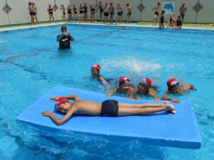 各クラスの王様を大型ビート板の上に乗せて,反対側まで運びます。