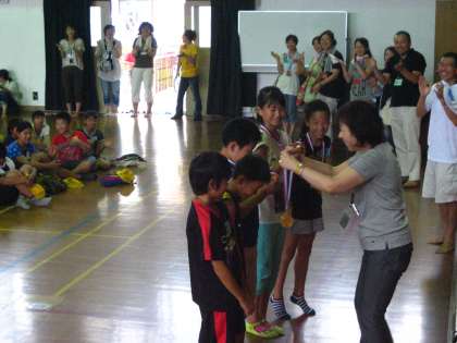 教頭先生の順位発表の後,1位のチームに校長先生よりメダルの授与がありました。