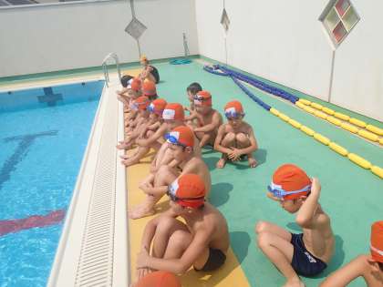 夏休みのプール開放に、たくさんの1年生が集まっています。太陽がギラギラ照りつける中で心地よくプールの水を浴びていました。夏休み中も元気な1年生たちです。