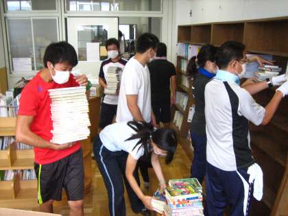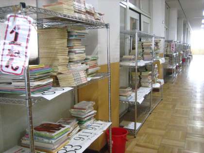 図書室の本を全部出して,棚を配置換えし,分類ごとにきちんと並べ替えました。