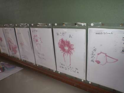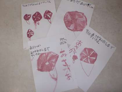 春に種をまいて、大切に育てたアサガオがたくさんの花を咲かせました。その花びらを集めて汁を取り出し、アサガオの絵をかきました。アサガオの花びらを使って、アサガオをかくことができました。