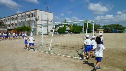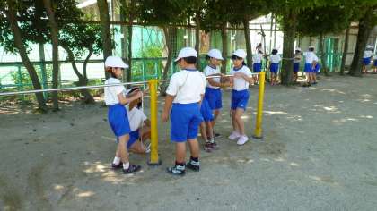 巻尺の目盛りに気をつけながら,鉄棒やサッカーゴール,七色ジャングルなどの高さ,横幅,周り,いろいろな物を測りました。