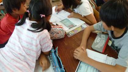 「なぜスーパーマーケットへ買い物をしに行く人が多いのか」について考え,グループごとに話し合って予想しました。