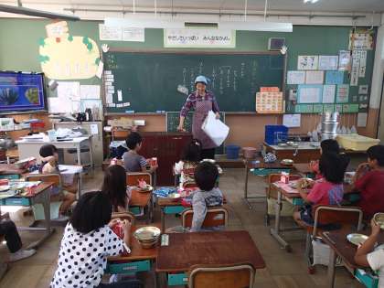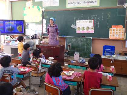給食指導の時間に、栄養教諭の八田先生に来ていただき、豆について教えてもらいました。この日の給食で食べた「野菜のスープ煮」には数種類の豆が入っていました。その名前と栄養について学習しました。