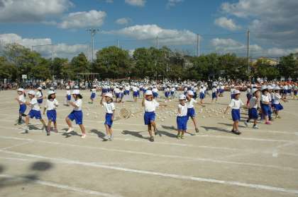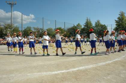 「なめこの歌」に合わせて、1年生148人の心がひとつになって、かわいく踊ります。