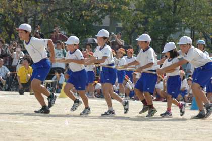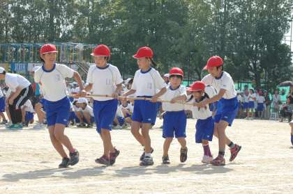 1年生から6年生が、みんなで力を合わせて列車を走らせます。息を合わせてゴールを目指します。出発!進行!!