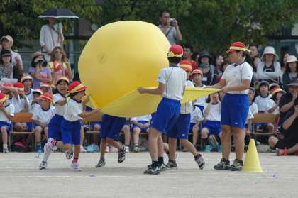 各チームが力を合わせて大玉を運びます。落とさないようにスピードもチームで工夫してがんばります。応援よろしくお願いします。