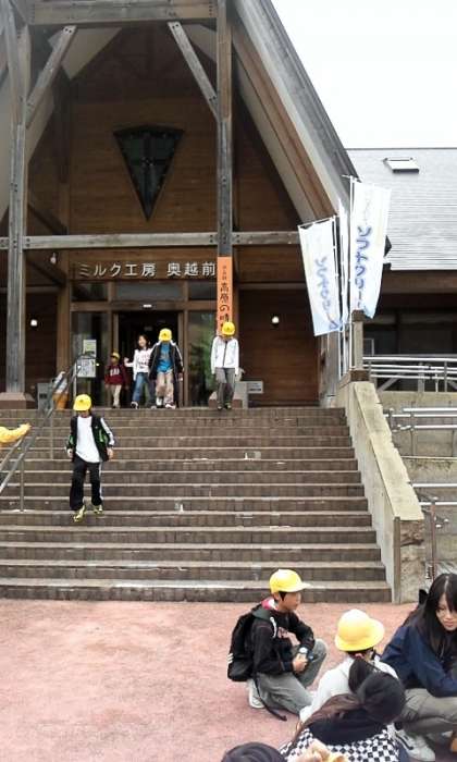 長い道のりも、元気に歩きました。目的地の「ミルク工房」に着いて少し休憩です。お弁当を受け取り、大自然の中で「いただきます!!」