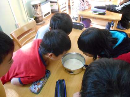 豆乳から湯葉ができるということを実際に見せてもらい,驚きの子どもたちでした。