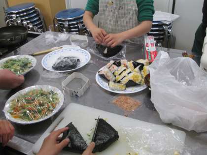 羽束師ファームの方々に教えていただきながら,「水菜と大根のナムル」「水菜の煮物」「壬生菜の漬物」「壬生菜のサンドイッチむすび」を作りました。