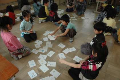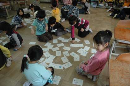 冬の言葉を集めてカルタを作りました。そして、自分たちで作ったカルタでカルタ取りをしました。言葉を考え、絵を描いて作っただけに、愛着があります。楽しい楽しいカルタ鳥でした。