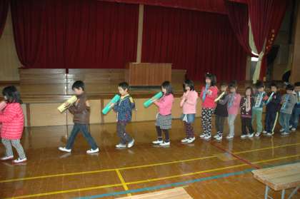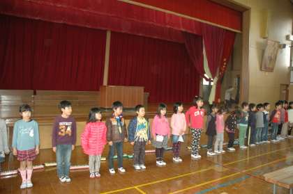 4月に入学する1年生の入学式に、新2年生がお迎えの言葉を言います。代表の25名で練習をしています。新1年生には、鍵盤ハーモニカの演奏と、優しい言葉の呼びかけ、そして歌を歌ってお迎えします。