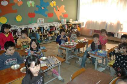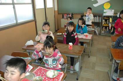 今日(19日)で今年度の給食が終了しました。1年生も大きく成長したのでたくさん食べることができるようになりました。この日も完食しました。一年間の感謝をこめて、「ごちそうさまでした!」