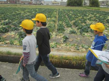 コースごとに,様々なことに気付いていました。「ここのコースは家が多かったんだ」「ここは店が多い」,「車が多い」,「田畑がある」,「ここの公園で遊んだことがある」などなど,校区内で様々な発見をしていました。