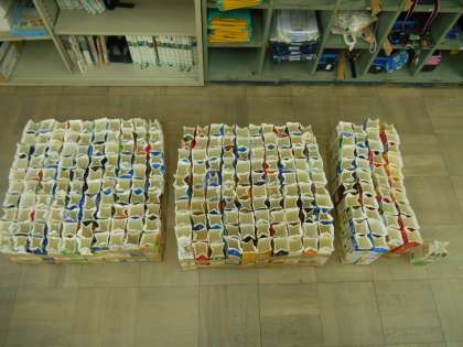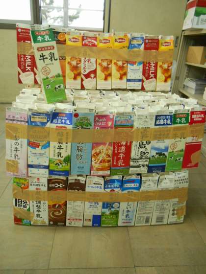1日に使う水道水の量を調べました。241Lだそうです。実際に1Lパックを使って241個並べてみると・・・