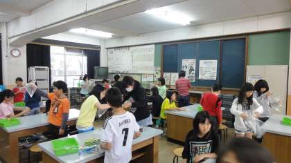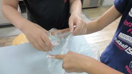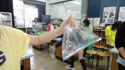 理科の学習で吸う空気とはいた空気の違いについて確かめるための実験をしました。空気をふくろに集めて、石灰水を使って調べました。これからの学習で、もっとくわしく学習していきます。