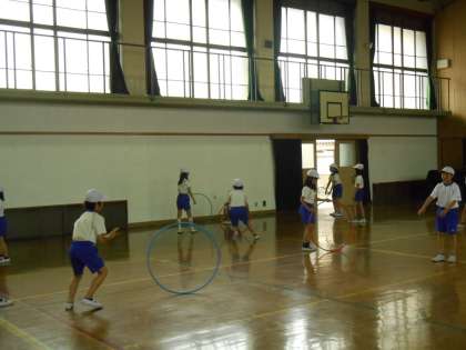 フープを使った運動をしたり,タグベルトを使っておにごっこをしたりしました。