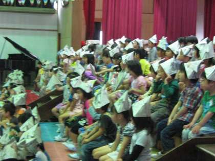 1年生をむかえる会がありました。入場する前に,6年生がつくってくれたかぶとをかぶり,みんなにっこり。体育館は5年生がつくってくれた気球が飾られていて,いつもの体育館とは違っていて,とてもわくわくした雰囲気の中で始まりました。クラスごとのお返事では,どのクラスもとっても大きな声でできました。各学年からの歌や合奏のプレゼントも素敵でした。そして,最後に今まで練習してきた「にじ」の曲を,手話をつけて発表しました。とっても元気いっぱい,笑顔いっぱいに歌えました。とってもとっても楽しい,1年生をむかえる会になりました!