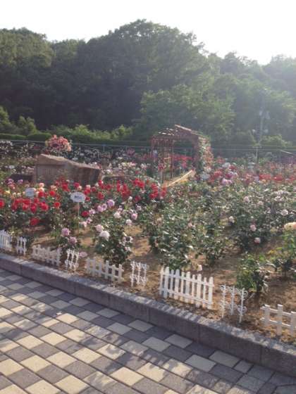 バスで岡山県のホテルへ向かっています。「ローズマインド福山」でトイレ休憩をしました。バラがきれいに咲いていました。