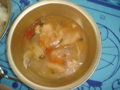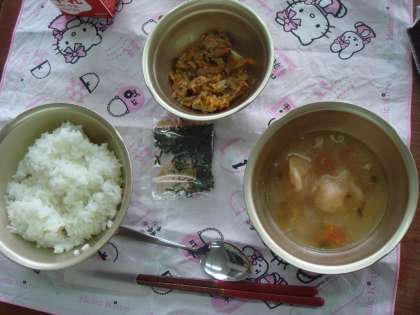今日の給食に新メニューの「トマトだごじる」が出ました。ていねいにトマトがねりこんであり,ピンク色でした。とてもおいしく,子どもたちは大喜びでした。