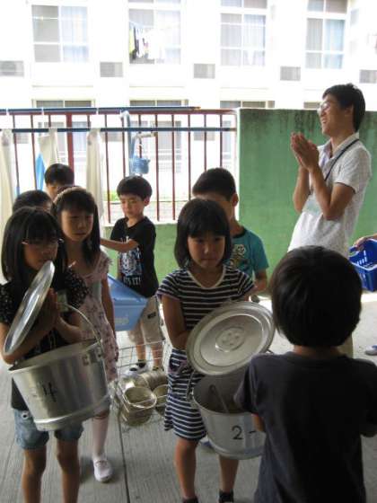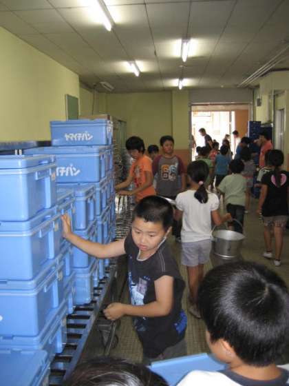 午後1時になると,給食の食器をクラスそろって返しに来ます。